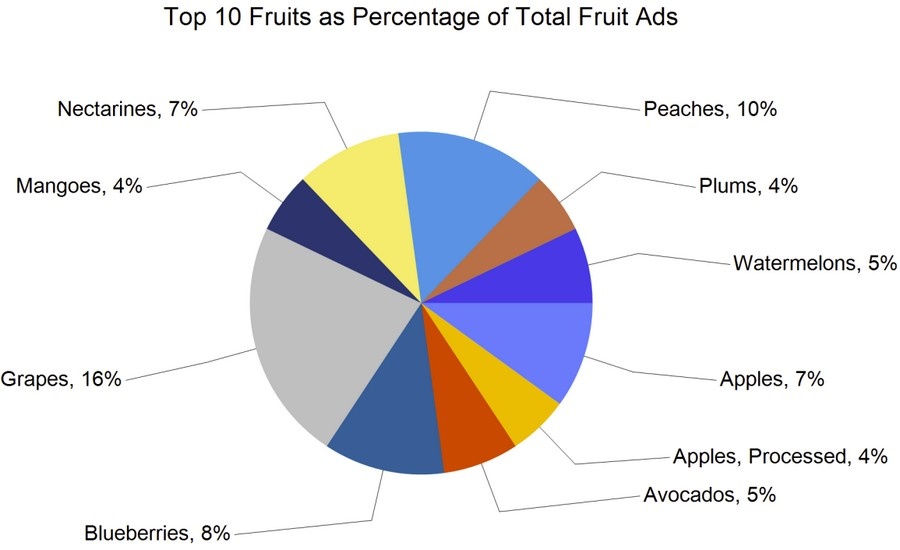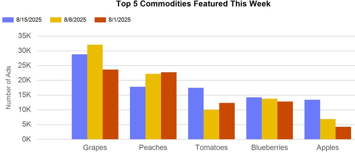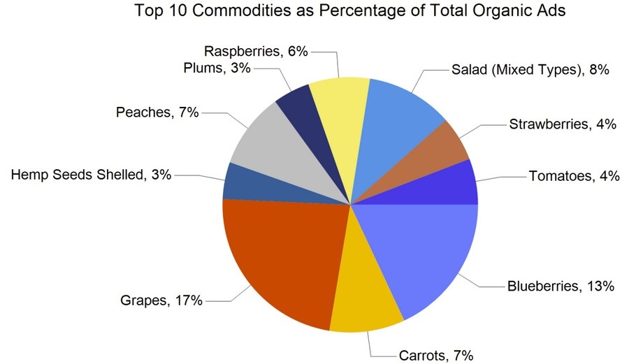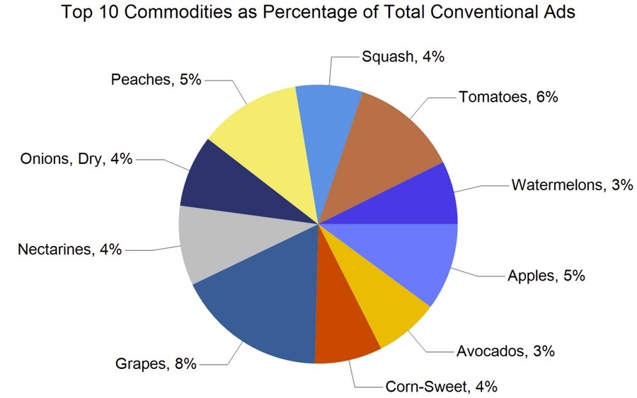 The total number of ads this week reached 318,130, a 9% increase compared to 292,163 last week. Compared to the same week in 2024, the total was 2% lower than the 325,888 reported at that time. By commodity group, fruit accounted for 181,422 ads (57%), onions and potatoes 19,433 (6%), vegetables 112,774 (35%), and herbs 2,813. Organic produce represented 42,369 ads, 13% of the total.