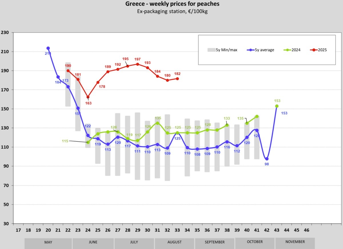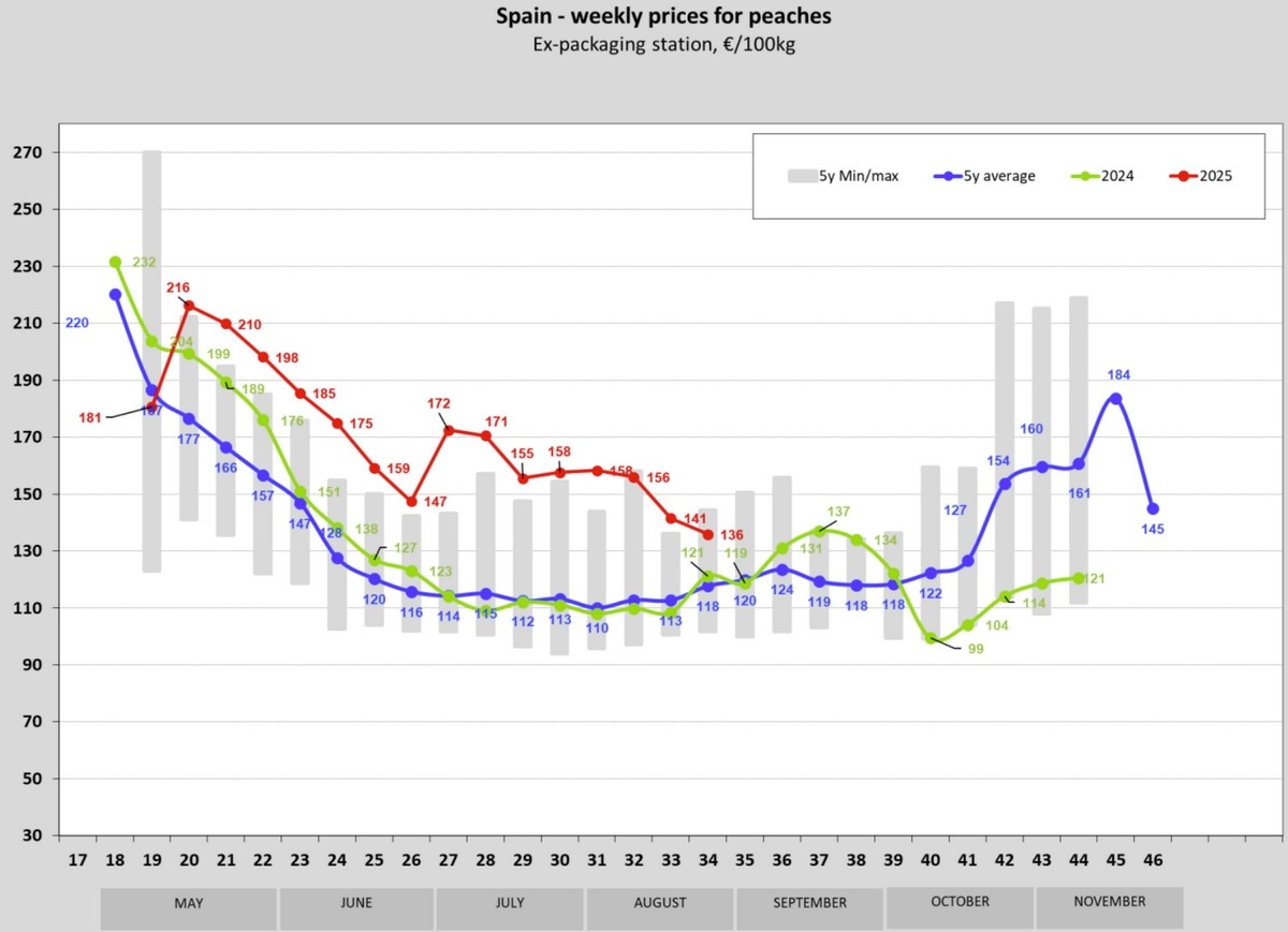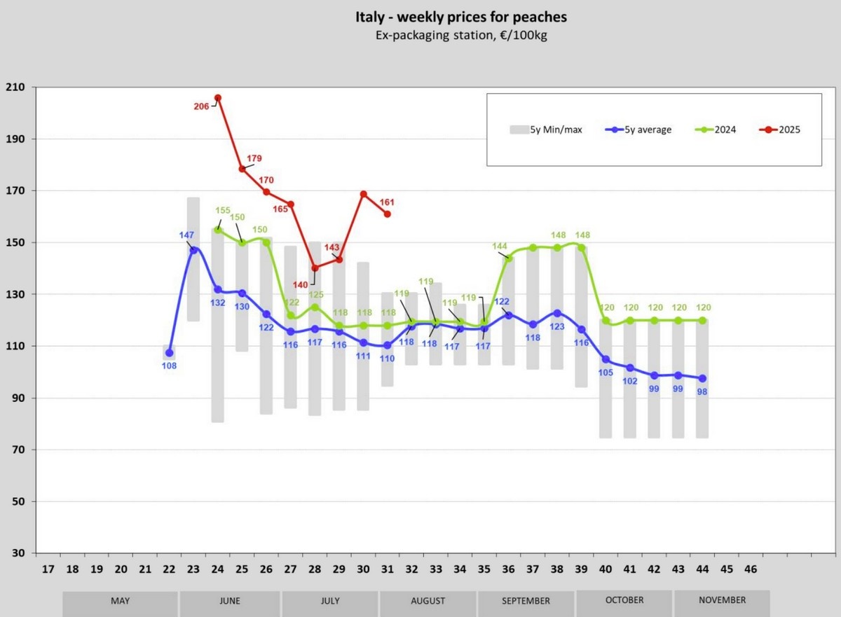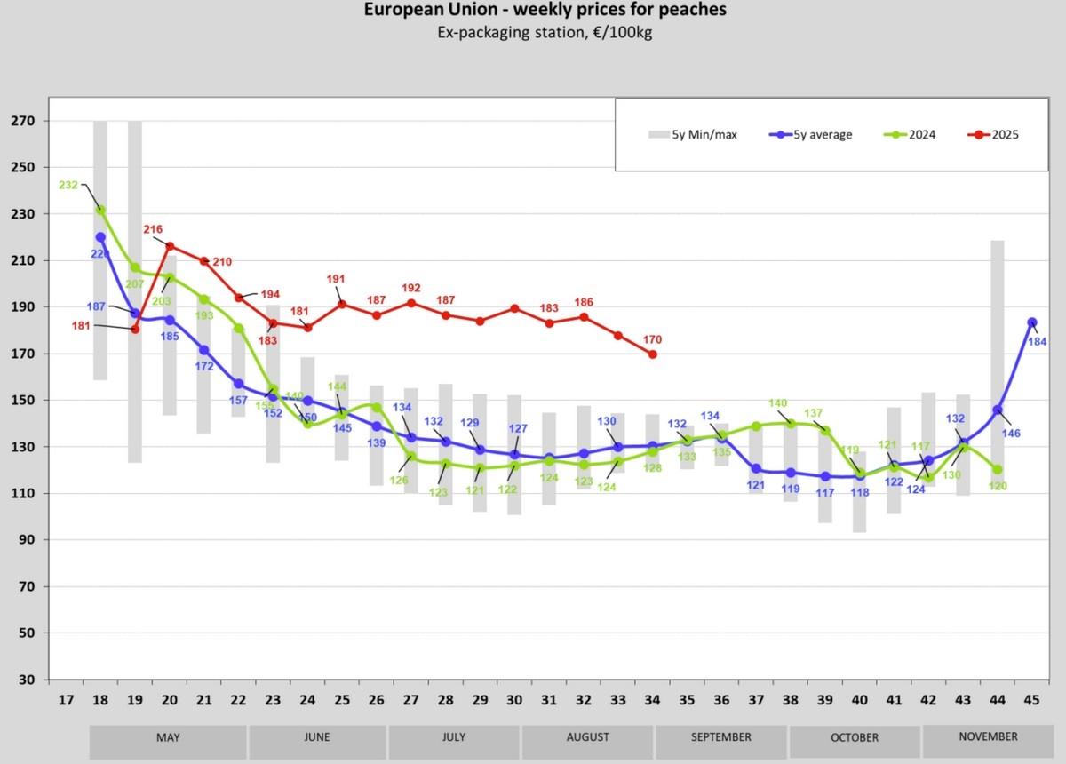 In the wider European Union, average peach prices dropped from €186/100kg in week 32 to €178 in week 33 and further down to €170 in week 34. This marks a steady decline over three consecutive weeks, underscoring seasonal supply impacts.