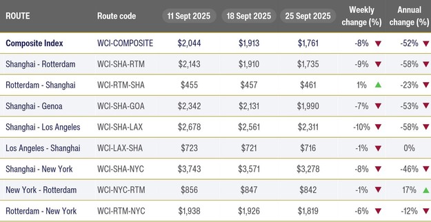 Asia–Europe spot rates also declined. Rates dropped 9% to $1,735 per 40ft container on Shanghai–Rotterdam and 7% to $1,990 per 40ft container on Shanghai–Genoa. Ocean carriers are reducing capacity to match slowing demand ahead of China's Golden Week holiday, when factories will close for eight days from 1 October. As a result, freight rates are expected to continue falling in the coming week.