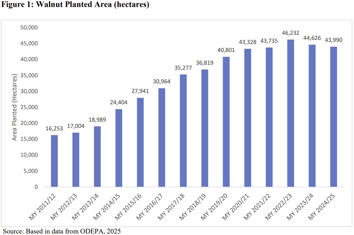 In Marketing Year (MY) 2025/26, walnut production in Chile is projected to reach 150,500 metric tons (MT), a 1.3 per cent decrease compared to 152,500 MT in MY 2024/25. The reduction is attributed to a smaller planted area of 43,500 hectares, down 1.1 per cent year on year, along with regular yields following favorable climatic conditions. The decline in area reflects market conditions and competition from more profitable crops such as cherries, lemons, and mandarins, as well as urban expansion.