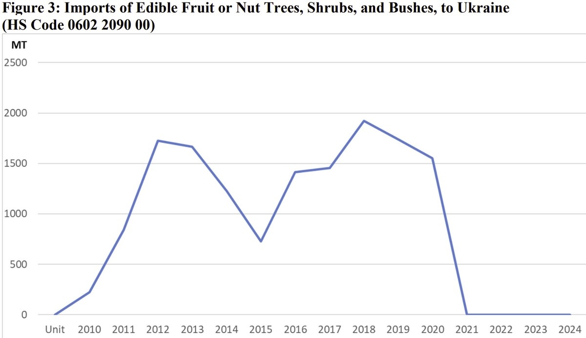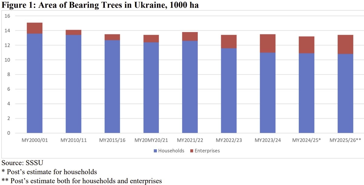 Post forecasts Ukraine's walnut production at 100,500 metric tons (MT) for marketing year (MY) 2025/26, similar to the previous estimate. Household production is declining as older trees are cut down, while industrial areas are also contracting due to limited investment during the Russia-Ukraine war and a shift to annual crops with quicker returns.