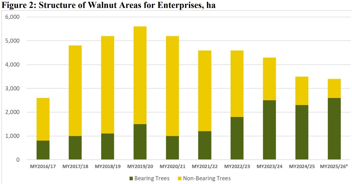 Post estimates household walnut area at 11,500 hectares (ha) in CY2025, compared with 12,100 ha in CY2023. Households account for about 80% of the bearing area, though yields are affected by a lack of irrigation in central and southern regions and cooler climates in the north.