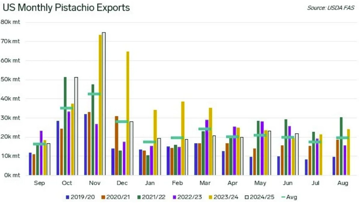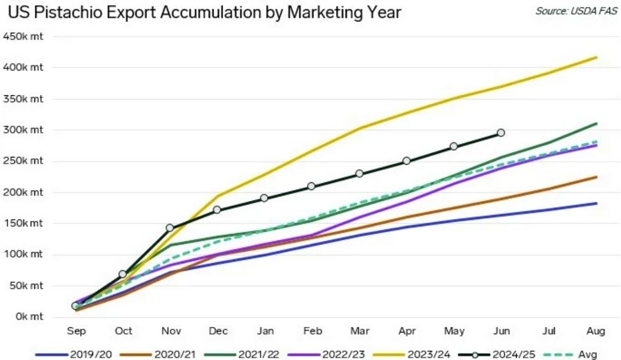 Current USDA balance sheet estimates (last updated in February 2025) project total exports for the 2024/25 marketing year at 360k mt. To achieve this target, U.S. pistachio exporters will need to ship an average of 32.9k mt each month from June through August. By comparison, the average monthly shipments for July–August in the 2019/20–2023/24 crop years were 18.6k mt.