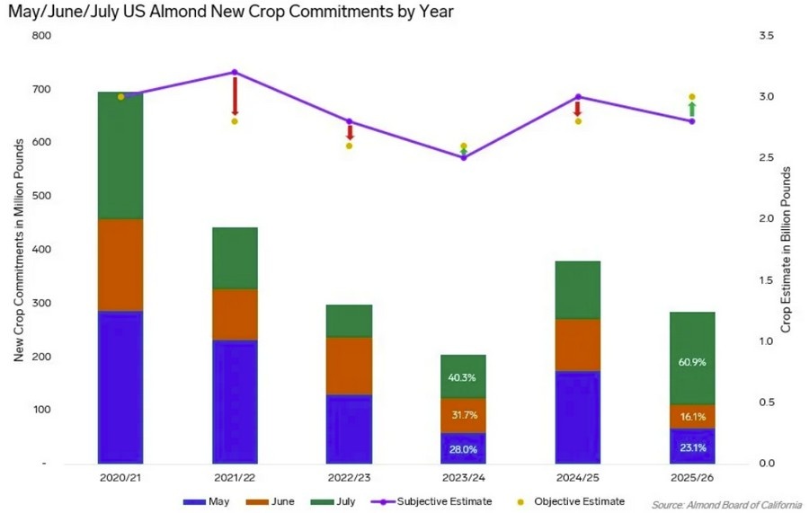 The Almond Board of California (ABC) released its July position report on August 12, focusing on supply and demand for the end of the 2024/25 crop year. The July report also included updated commitments for the 2025/26 crop, with the new marketing year starting in August.