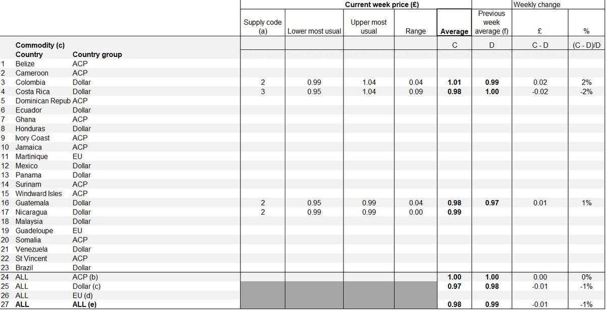 By contrast, Costa Rica registered a small decline, with prices edging down from £1.00 to £0.98 per kilogram, equal to a £0.02 or 2% decrease. Guatemala showed a marginal gain, with the average price rising from £0.97 last week to £0.98 this week, up £0.01 or 1%. These shifts underline a varied pattern across producing countries, with Colombia and Guatemala showing minor upward adjustments while Costa Rica slipped back slightly.