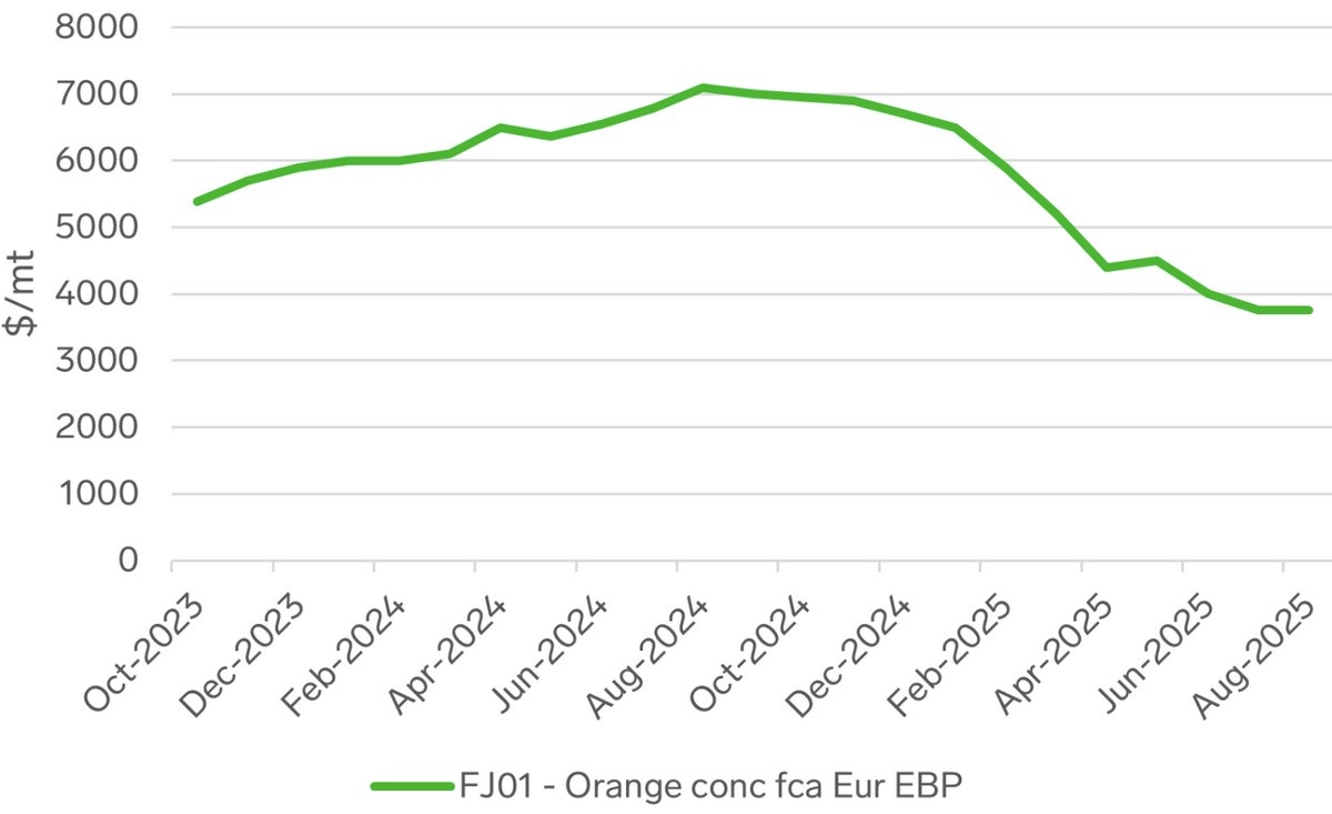 Market sources told Expana that the forecast revision has not yet affected orange juice prices, as demand remains subdued. In August, Expana Benchmark Prices (EBP) for orange concentrate FCA Europe [Expana code: FJ01] were reported at US$3,750 per metric ton, unchanged from the previous month. Sources described trade as limited, reflecting the seasonal lull and pending tenders from major retailers.