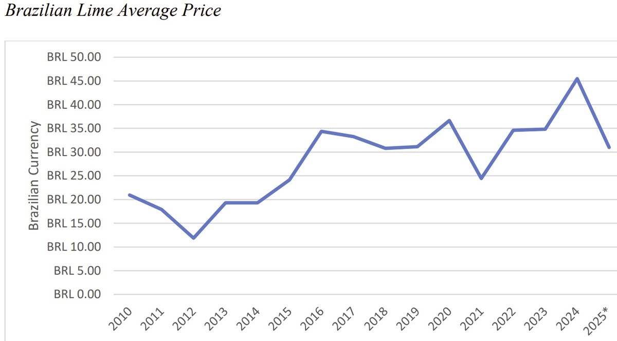 Lime trees reach peak productivity at around five years of age. Harvesting runs from November to March/April, with medium volumes from March to June and lower volumes between July and November. Production complements Mexico's supply, giving Brazil a year-round presence in international markets.