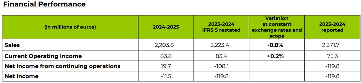 Including non-recurring items of -€10.8 million (US$11.6 million), mainly linked to U.S. logistics optimizations and restructuring costs, operating income stood at €73.0 million (US$78.2 million), compared with -€56.4 million (US$-60.4 million) the previous year. Net income from continuing operations was €19.7 million (US$21.1 million), or 0.9 per cent of sales, compared with -€108.1 million (US$-115.7 million) in 2023/24.
