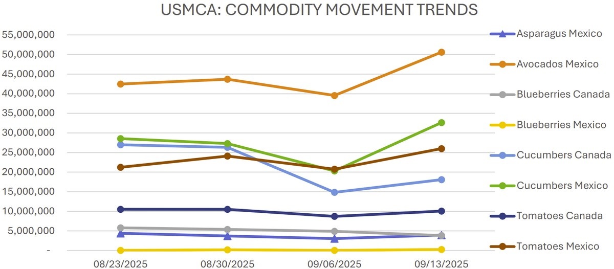 Imports from Peru through Miami, Philadelphia, and New York are increasing, with most shipments tied to prior bookings. Supplies are too limited for a market to be established. Chilean imports through Philadelphia are also rising, with the first F.O.B. report expected the week of September 28. Mexican crossings are expected to increase seasonally, with the first report due October 5. Supplies from British Columbia, Oregon, Washington, and Michigan are decreasing seasonally, with current volumes too limited to establish a market.