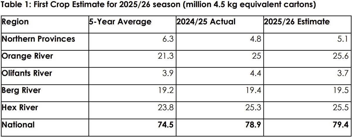 The South African table grape industry has released its first crop estimate for the 2025/26 season, projecting a harvest of 79.4 million cartons. The estimate sets a lower limit of 77.0 million cartons and an upper limit of 81.7 million cartons.