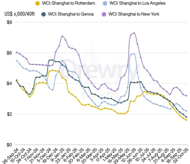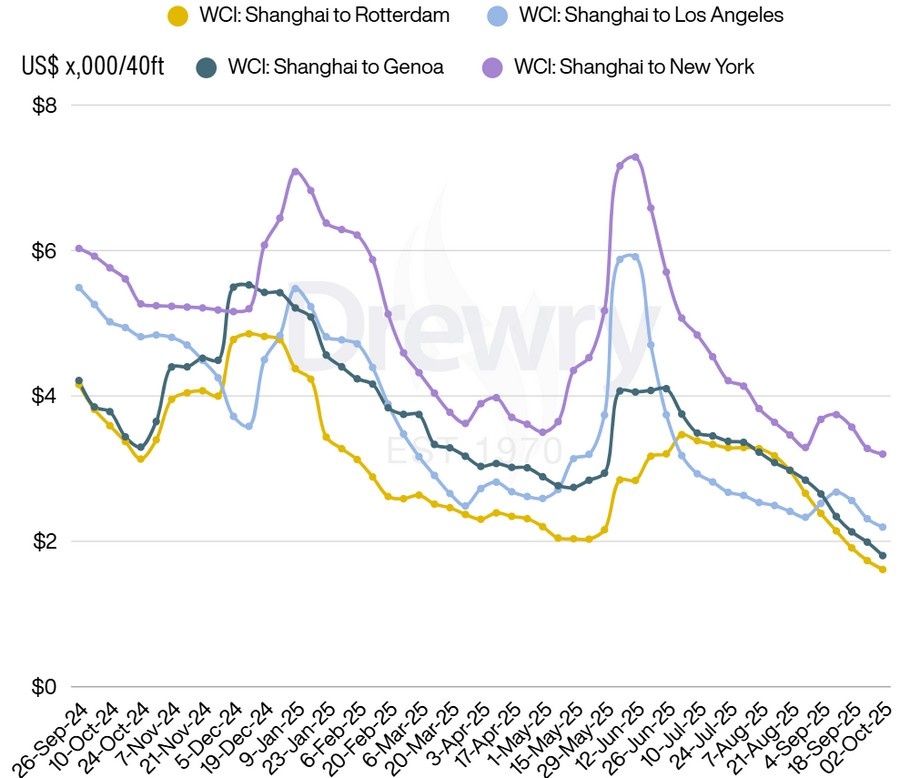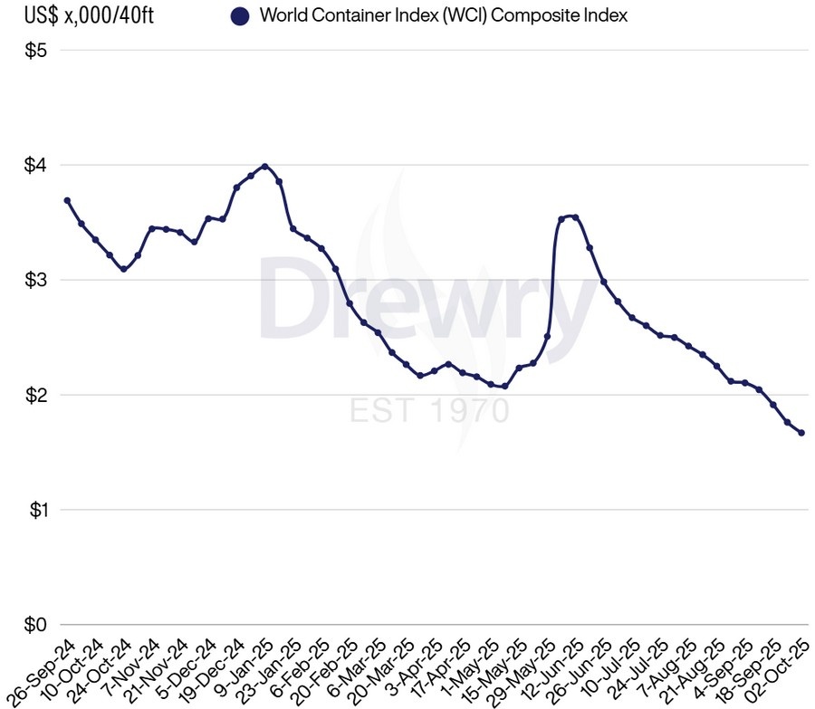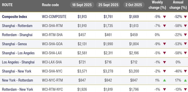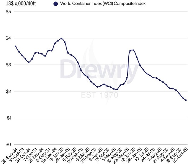 The Drewry World Container Index (WCI) fell 5% to $1,669 per 40ft container, marking the 16th consecutive weekly decline and reaching the lowest level since January 2024.