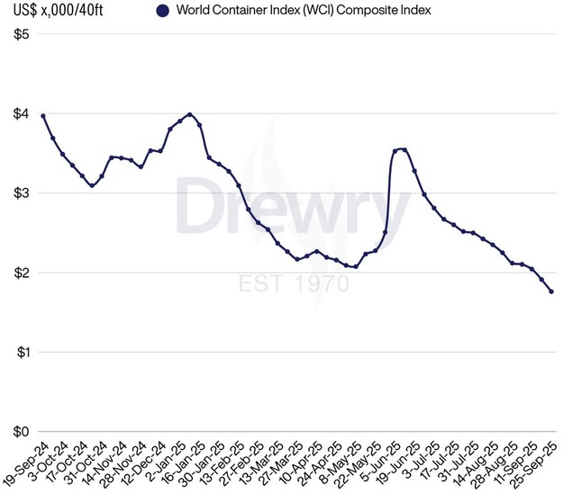 The Drewry World Container Index (WCI) fell 8% to $1,761 per 40ft container, marking the 15th consecutive week of decline. Rates on major trade routes, including Transpacific and Asia–Europe, also continued to trend downwards.