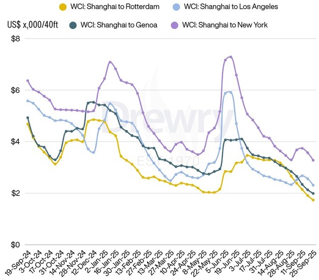 Asia–Europe spot rates also declined. Rates dropped 9% to $1,735 per 40ft container on Shanghai–Rotterdam and 7% to $1,990 per 40ft container on Shanghai–Genoa. Ocean carriers are reducing capacity to match slowing demand ahead of China's Golden Week holiday, when factories will close for eight days from 1 October. As a result, freight rates are expected to continue falling in the coming week.