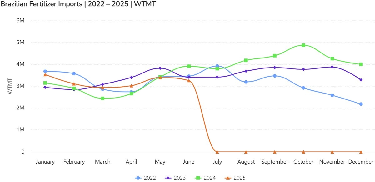 Brazil imported 4.79 million tons of fertilizers in July, the highest monthly volume of 2025, according to data from the Ministry of Industry and Foreign Trade (MDIC). The figure represents an increase of 15.6% compared to June and 7.1% compared to July 2024, setting a record for that month.