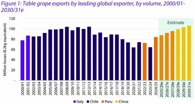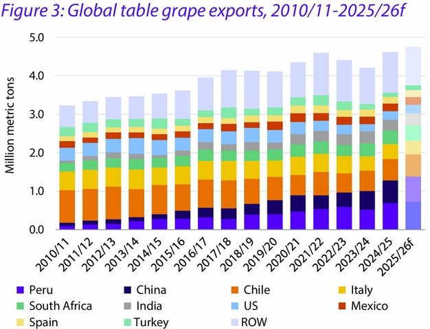 Peru has surpassed Chile to become the world's leading exporter of table grapes, while China is emerging as a major competitor, according to a recent RaboResearch report. Global exports reached 4.6 million metric tons in 2024/25, the highest on record, with projections suggesting further changes in trade flows by the end of the decade.
