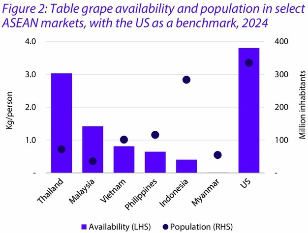 In North America, U.S. table grape exports are stabilizing, supported by increased demand in Mexico. Growth in Mexico is linked to retail expansion and steady consumer demand. Despite earlier weather-related disruptions, South American exports rebounded in 2024/25 to reach 1.3 million metric tons, setting a higher baseline for the current season.