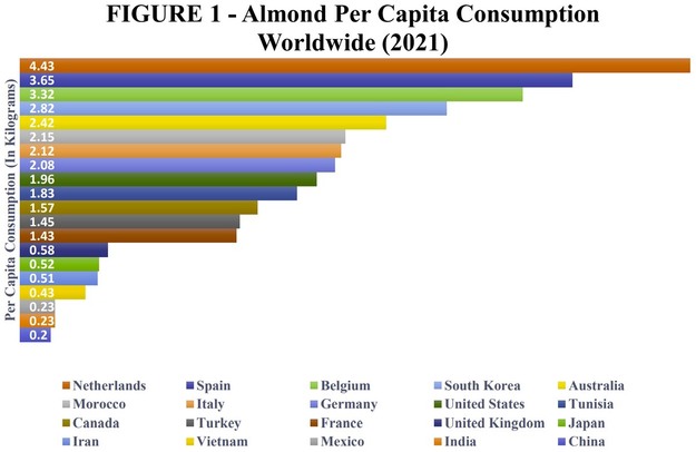 India ranks second globally in almond consumption after the United States. Per capita consumption remains low at 0.23 kilograms compared to over 1 kilogram in other markets, suggesting scope for further growth. India's healthy snacks market, valued at US$3.91 billion in 2024, is forecast to reach US$6.12 billion by 2030.