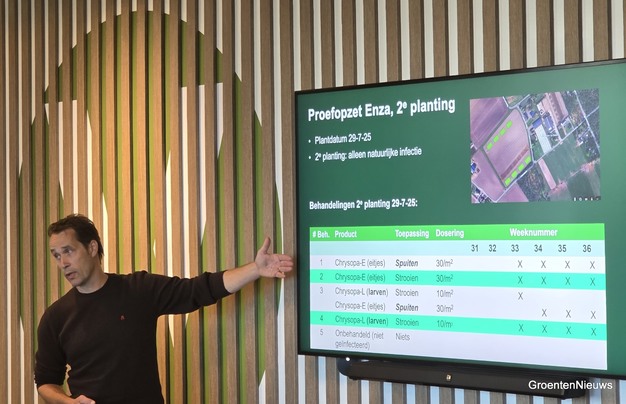 On behalf of Koppert, Pascal Staaks presented research results on iceberg lettuce cultivation. The company, known for its expertise in biological control, is focusing on the green lacewing, Chrysoperla carnea, as a tool against aphids.